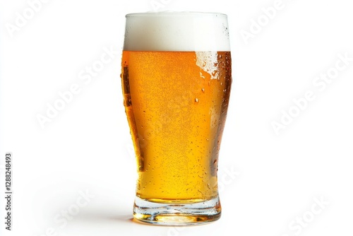 Tall beer glass with foamy head on white background. Neural network AI generated
