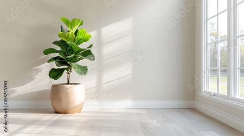 Tall fiddle leaf fig tree in a rustic clay pot, sitting on white oak floors of a modern farmhouse dining room, large windows flooding the space with natural light