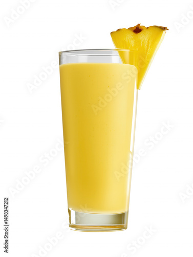 Tall glass of yellow smoothie with pineapple wedge on transparent background