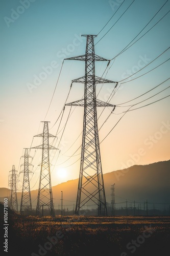 Tall power lines stretch across a rural landscape at sunset.