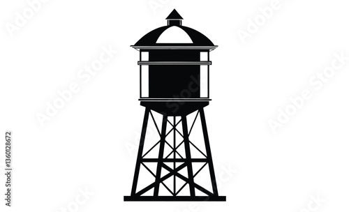 Tall water tower front silhouette, Water tower icon, Black silhouette, Vertical front side view, Vector simple flat graphic illustration, Isolated object on a white background