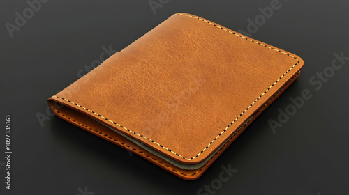 Tan leather wallet, stitched edges, on dark background.
