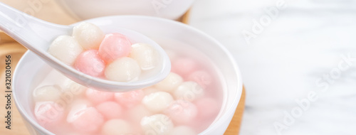 Tang yuan, tangyuan, delicious red and white rice dumpling balls in a small bowl. Asian traditional festive food for Chinese Winter Solstice Festival, close up.