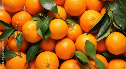 Tangerines with leaves as background, top view. Fresh citrus fruits