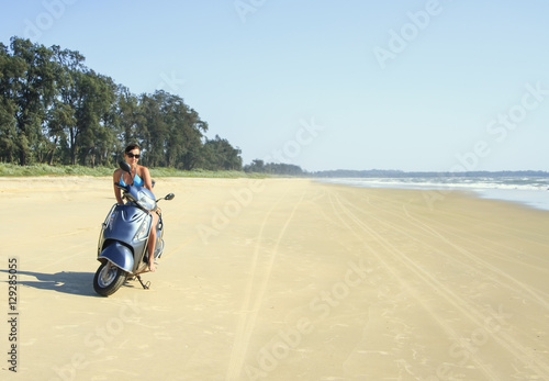 Tanned brunette rides on a deserted beach along the ocean at mot