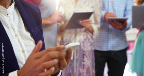 Tapping man in navy blazer, white shirt checking white phone at meeting, with tablets, copy space