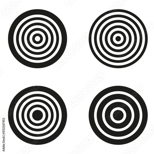 Target circle designs. Bullseye pattern icons. Black ring elements. Vector aim symbols.