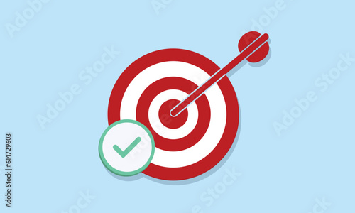Target with arrow hit center and check mark. Marketing time concept.