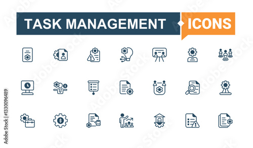 Task Management icon. It contains symbols to team, implementation, marketing, communication, set and more. Project Management icon pack. Icons for design. Vector outline and solid icons collection.
