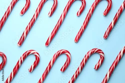 Tasty candy canes on light blue background, flat lay. Merry Christmas and Happy New Year