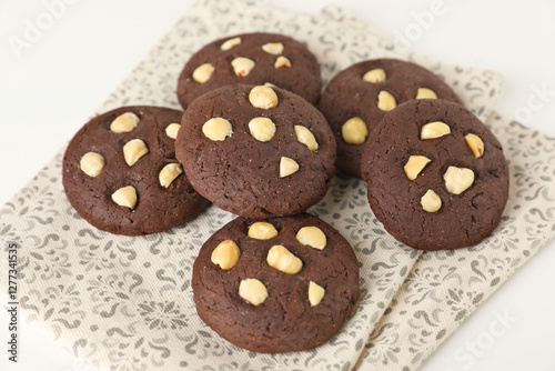 Tasty chocolate cookies with hazelnuts on white table, closeup
