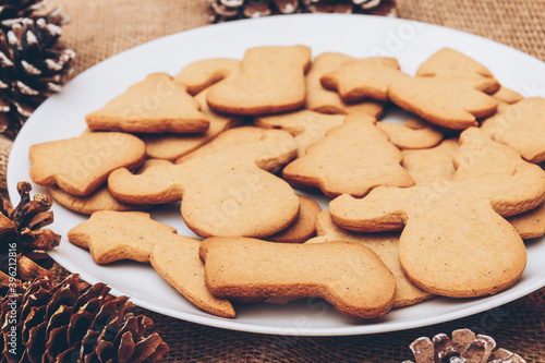 Tasty Christmas gingerbread cookies on the white plate on a sackcloth.