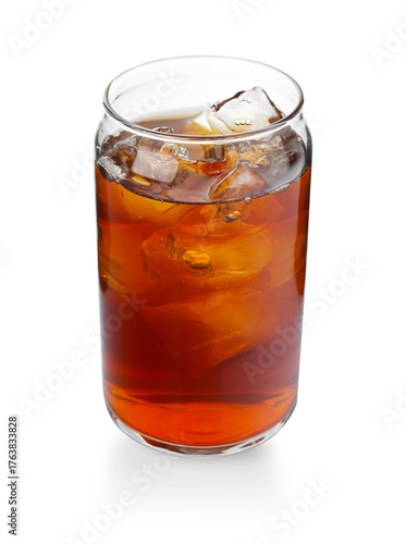 Tasty coffee with ice cubes in glass isolated on white