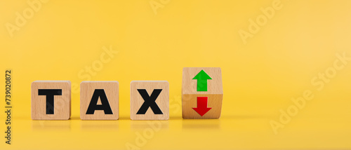 Tax fluctuation concept, Tax Increase or Decrease, Financial Planning, Tax rates, Taxation, Wooden block with text TAX and up and down symbol arrows on flipping block, Copy space.
