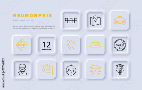 Taxi icon set. ID card, passport, data, phone, call, silhouette, driver, uniform, 24 hour work, steering wheel, sign, traffic light, car. Transportation service concept. Neomorphism style.