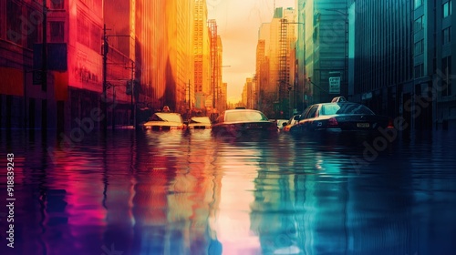 Taxis stranded on a flooded downtown street, The scene illustrates urban flooding and climate challenges.