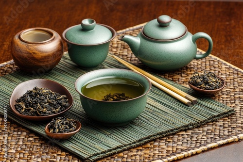 Tea set on bamboo mat
