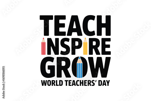 Teach inspire grow world teachers day with pencils in red yellow and blue on a white background art