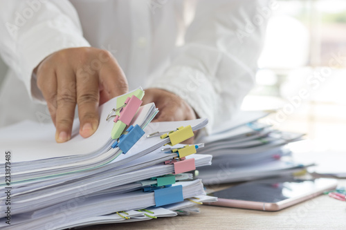 Teacher hand is searching student reports and homework assignment on desk in school for score. Unfinished paperwork stacked in archive with colorful binder paper clip. Education and business concept.