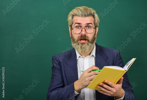Teacher with textbook. Experienced teacher. Selecting appropriate courses. Teacher with book explain topic. Man in front of chalkboard. College and high school. Literature subject. Reading books
