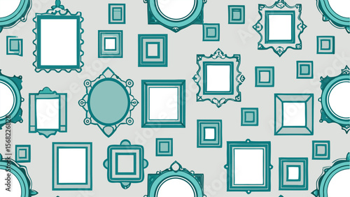 Teal and grey decorative picture frames arranged on a light grey background decorative frame
