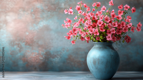 Teal ceramic vase with pink flowers, vintage floral still life, romantic arrangement, pastel decor
