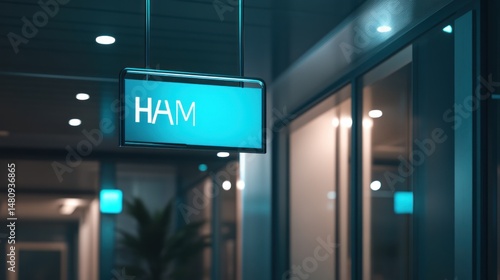 Teal hanging sign ham modern indoor office setting corporate design