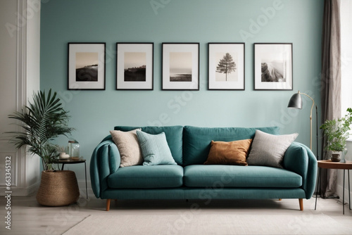 Teal sofa and modern picture frames on the wall. Scandinavian home interior design of modern living room.