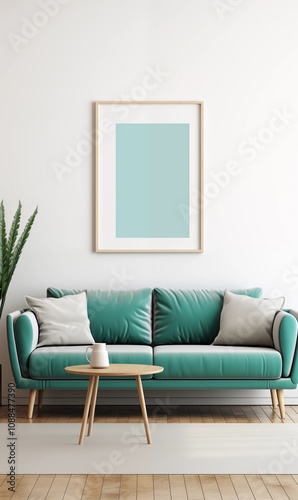 Teal Velvet Sofa Wooden Coffee Table Light Rug Minimalist Living Room Interior