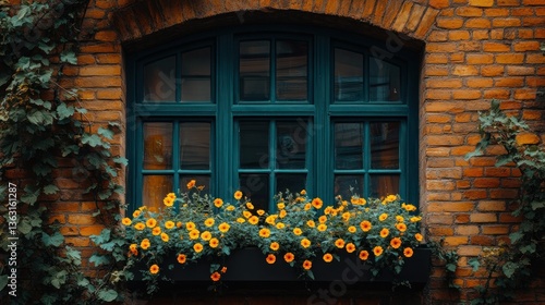 Teal window with orange flowers in brick wall