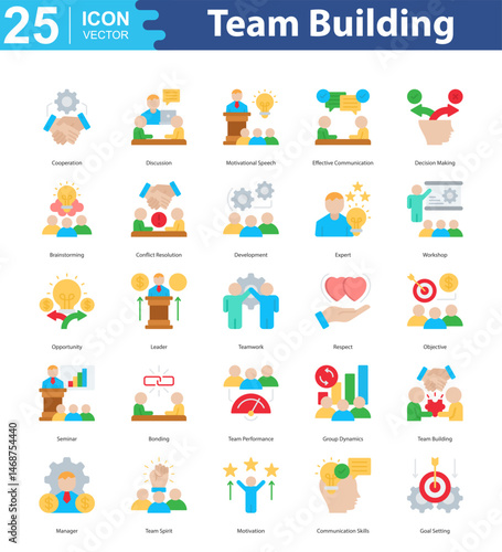Team Building Icon sheet vector cooperation, discussion, motivational speech, effective communication, decision making, brainstorming, conflict resolution, development, expert, workshop, opportunity