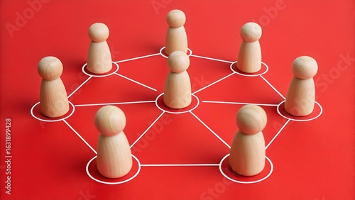 Team Network Structure – Connected Wooden Figurines in Circular Web on Red Background, Collaboration, Social Link Concept