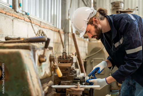 Team of engineers practicing maintenance Taking care and practicing maintenance of old machines in the factory so that they can be used continuously.
