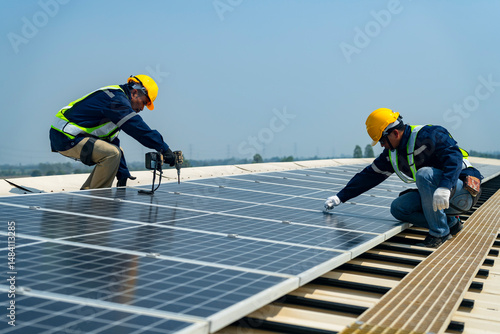 team of professionals installs solar panels, ensuring energy efficiency and sustainable development. The image represents green energy, eco-conscious solutions, and future solar power technology.