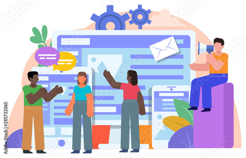 Team working on cross-platform website. People stand near big screen, smartphone, tablet. Poster for web page, social media, banner, presentation. Flat design vector illustration