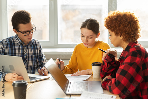 Teamwork brainstorm. Diverse colleagues working together discuss financial statistics. Group of happy young modern people sitting in creative office discussing business. Young professional team