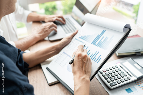 Teamwork concept, Business executives discussing document work at meeting in modern office lobby.