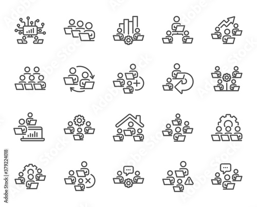 Teamwork line icons. Working at home, online team worker, remote office. Artificial intelligence, growth chart, online home job line icons. Remote team work, people study, programmers. Vector
