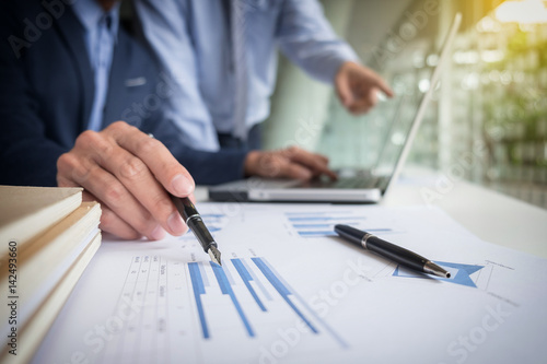 Teamwork process, Businessmen hands pointing at laptop and document during explanation of new plan project data at meeting.