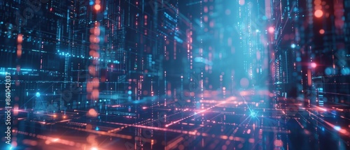 Tech gadgets floating in a digital matrix, with glowing lines, futuristic, blue tones, 3D rendering