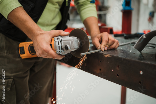 Technician worker cutting metal with many sharp sparks. Using equipments to cat iron