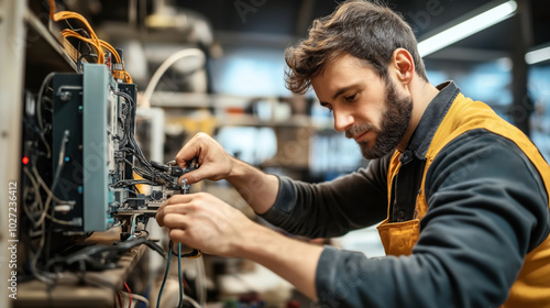 Technician working on electrical panel with tools in a workshop wearing work vest and focused on task