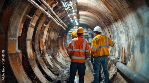 Technicians and engineers inspecting underground drainage systems at a factory site.