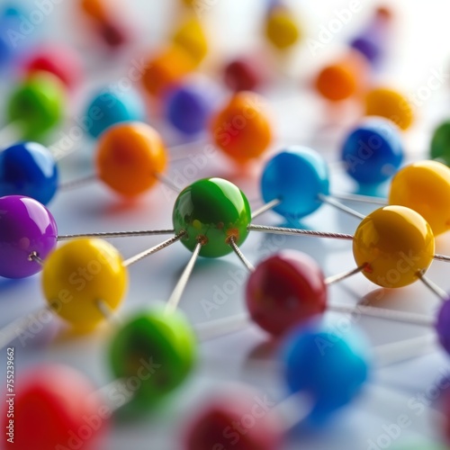Technological Link: Abstract depiction of communication and connection with color spheres connected by wires, symbolizing the technological link in a digital world.