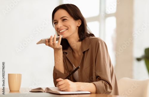 Technology, Communication And People Concept. Cheerful student using voice command recorder on cellphone and writing