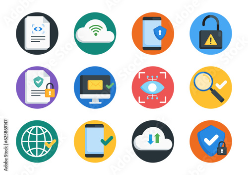 Technology flat icon pack. Internet security vector set. Computer, cloud, phone, lock, shield, scan, document, illustration.