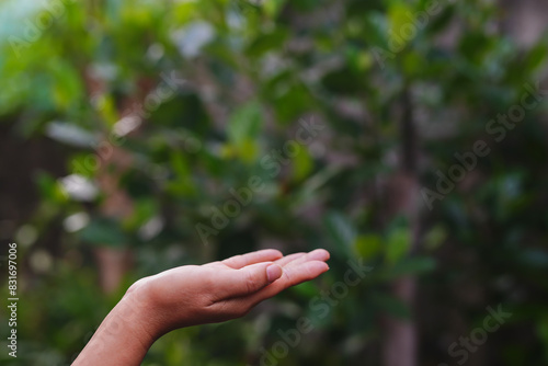 Technology, hand holding with environment Icons over the Network connection on green background.