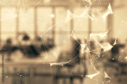 Technology theme drawing with office interior on background. Multi exposure. Concept of innovation