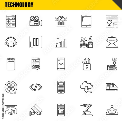 technology vector line icons set. calculator, industrial robot and notepad Icons. Thin line design. Modern outline graphic elements, simple stroke symbols stock illustration