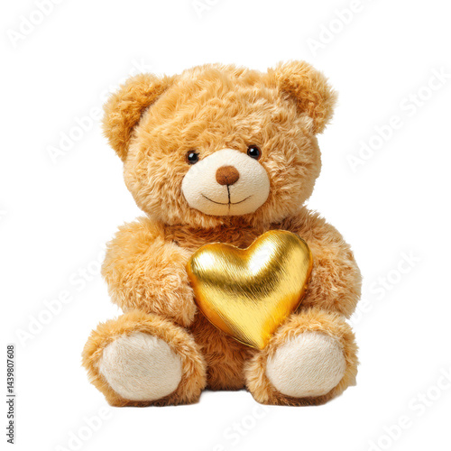 Teddy bear holding golden heart on transparent background